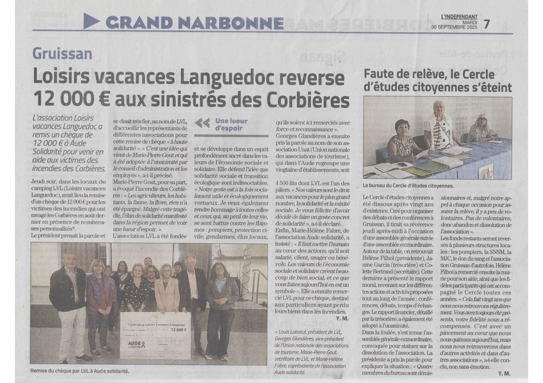 12 000 € offerts par l'association Loisirs Vacances Languedoc aux sinistrés des incendies des Corbières